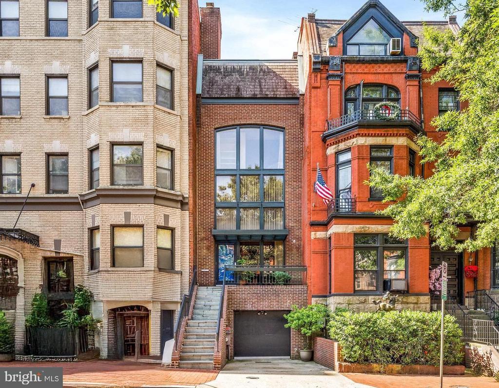 A rare study in form, material, and spatial drama, this modernist residence was custom-built in 1980 as a striking counterpoint to its Victorian-inspired neighbors. Offering 3 bedrooms, 2.5 baths, and four levels of living space, the home delivers nearly 2,900 square feet of bold yet livable design. Elevated from the street, a private front terrace and double-height glass foyer set the tone. Inside, the main level features a luminous living room with a gas fireplace, sculptural screen, custom built-ins, and integrated audio. The adjacent chef’s kitchen—anchored by a massive stone island—boasts a 6-burner gas range, wine fridge, and extensive custom cabinetry. Beyond, a glass-wrapped dining/family room opens to a beautifully hardscaped brick patio: private, serene, and ideal for entertaining. Upstairs, the second level hosts two spacious bedrooms and a full bath, while the top floor is devoted to a king-sized primary suite with fireplace, sitting area, generous closet space, and a skylit marble bath with soaking tub, dual vanities, and a glass-enclosed shower. The lower level includes a powder room, wine cellar, flexible bonus space, laundry, and direct access to an oversized two-car garage with workshop and additional driveway parking. Architectural moments abound—from clerestory windows and skylights to custom millwork and built-in shelving—all wrapped in glass and grounded in warm, natural materials. A truly unique offering in the heart of Dupont Circle, just moments to boutiques, restaurants, museums, fitness studios, the Metro, and the very best of Washington, DC. Note that the tall brick planter in the rear can be easily removed.