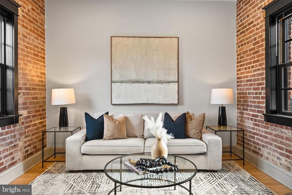 Welcome to the Quarters at Liberty, a collection of six new 1-2 bedroom, two-level condominiums developed by The Alexander Company inside the historic residences of the former prison guards. With an industrial loft aesthetic, this spacious 2,080 SF home welcomes visitors into an open floor plan with a living room, dining area, and kitchen. The generously proportioned kitchen offers a breakfast bar, gas range, stainless steel appliances, granite countertops, and plentiful storage. Just off the kitchen, the bright family room is appointed with exposed brick walls. A powder room and coat closet complete the main level. Just upstairs are a home office area, primary suite with a large walk-in closet, en-suite bathroom and laundry, and a second bedroom with walk-in closet and bathroom. A second home (#101) is available to tour and purchase: a one bedroom, two-level, 1345 SF home offered for $540,000. Residents of the Quarters enjoy all the amenities of Liberty including the fitness room, yoga room, community center, outdoor pool, playground, and Liberty Green. Residents of Liberty enjoy shopping at Lidl, dining at Taco Rock, Yafa Grille, Ledo Pizza, and Kokee Tea, as well as working out at F45 or Capital MMA. Parents appreciate the convenience of the renown Brynmar Early Education and Preschool right there at Liberty. The Quarters is conveniently located less than 1.5 miles from I-95, 5 miles from Occoquan, 9 miles from Fort Belvoir, 17 miles from the Pentagon, 20 miles from Reagan National Airport and Washington, DC.